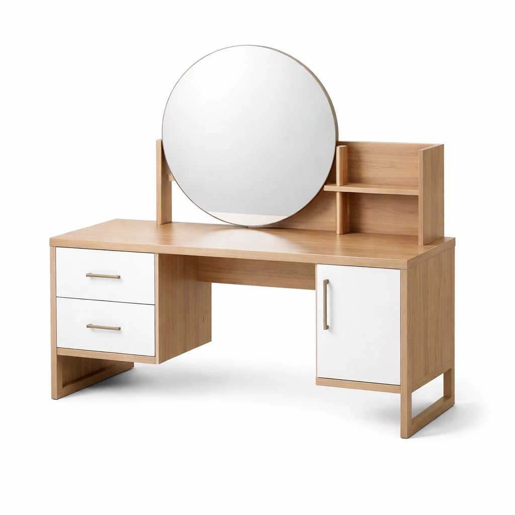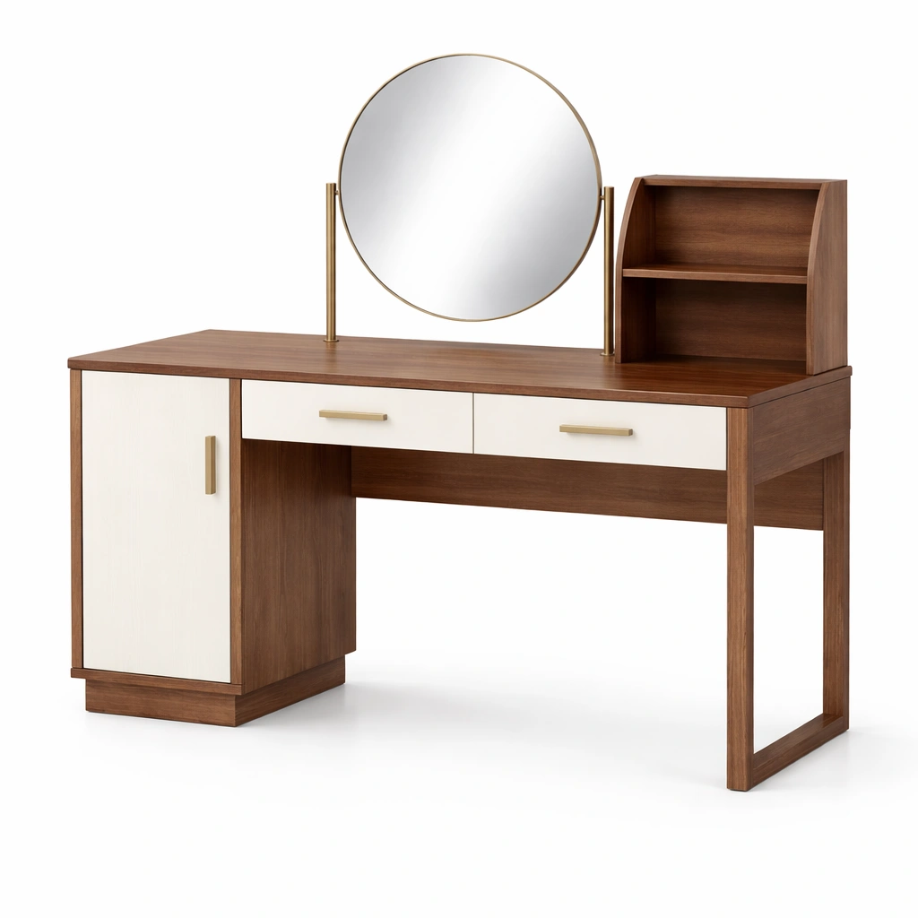 Schminktisch MDF Holz Walnussweiß Runder Spiegel 120x50x140 cm