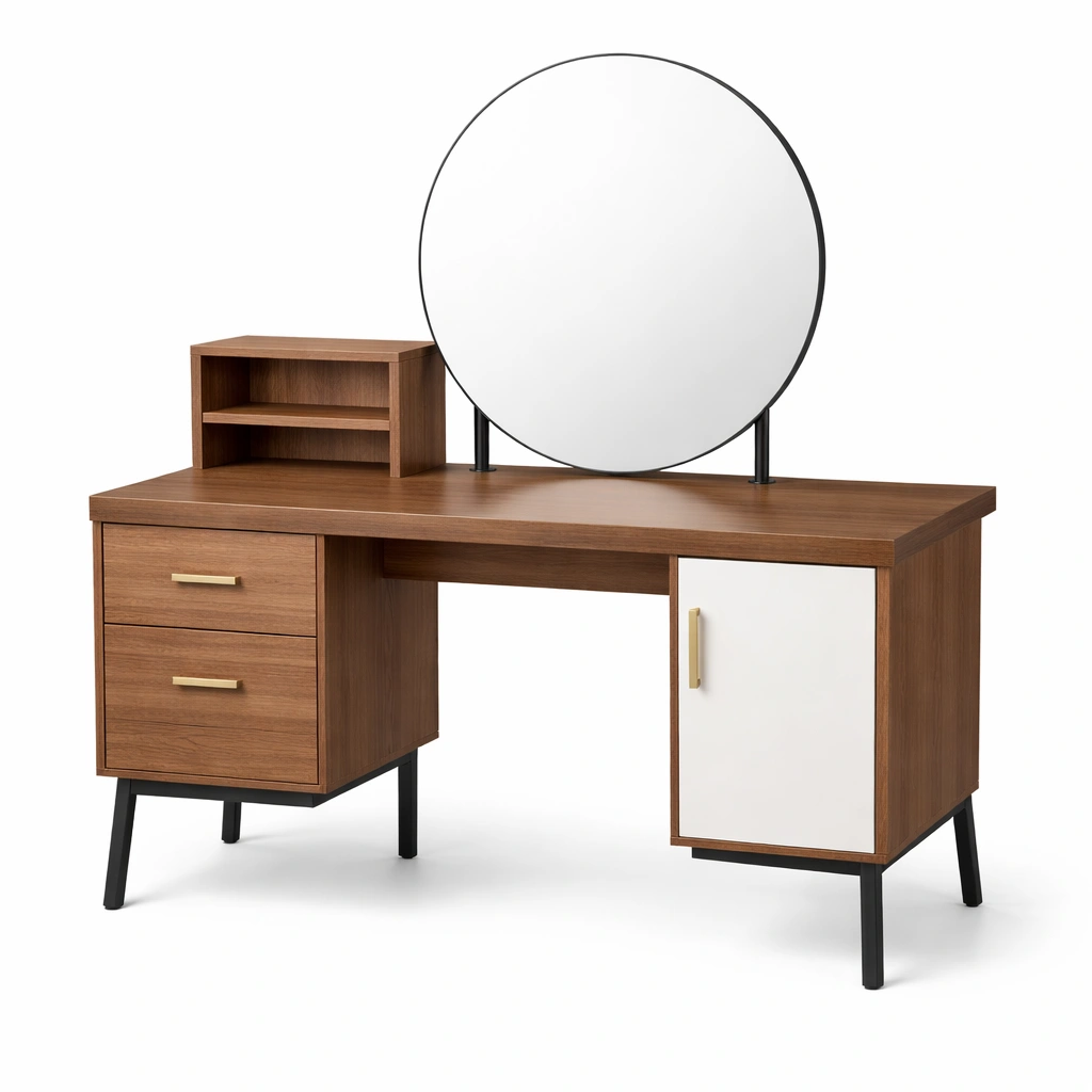 Der Schminktisch besteht aus einer Tischplatte mit MDF-Holzfurnier, Metallbeinen und einem runden Spiegel mit einem Durchmesser von 50 cm. Er verfügt über zwei Schubladen auf der linken Seite und ein Staufach auf der rechten Seite.