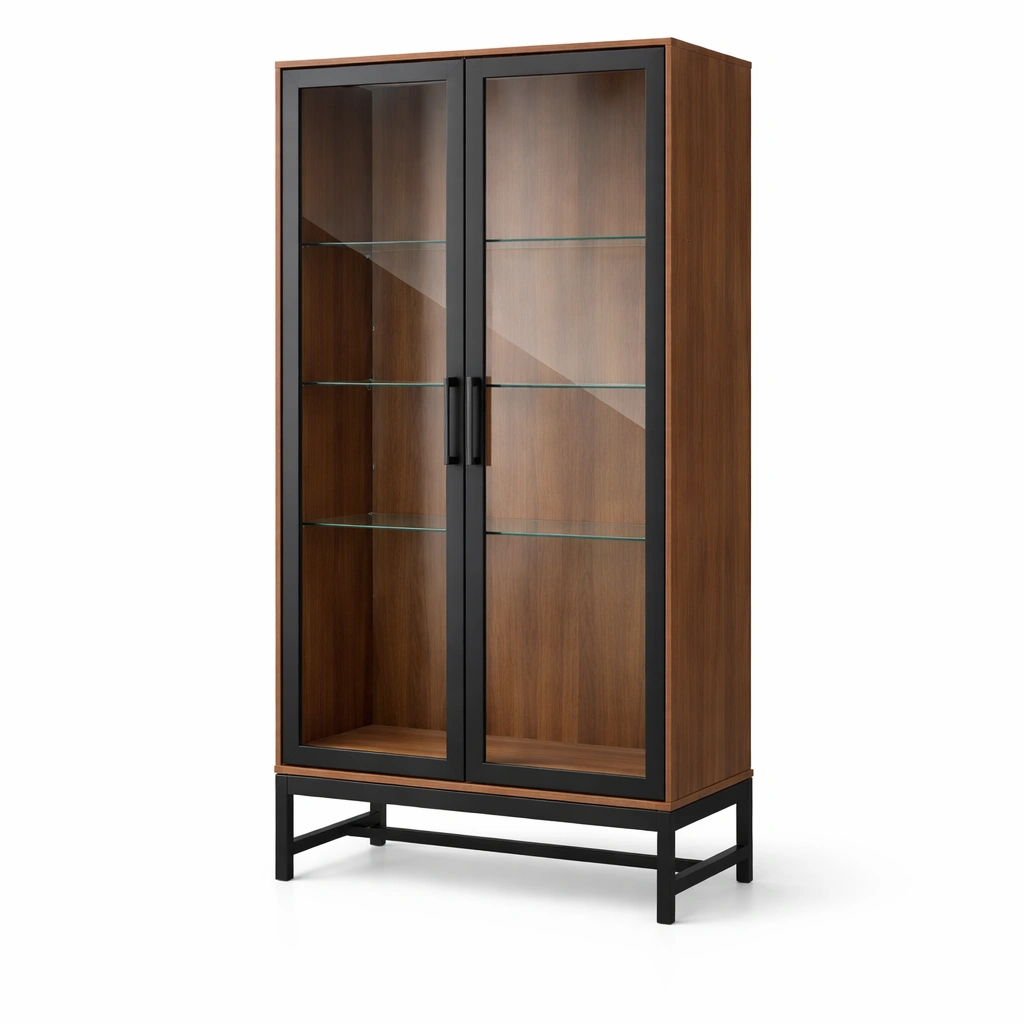 Die Vitrine besteht aus Spanplatte mit Walnussfurnier. Die Türen sind aus gehärtetem Glas gefertigt, und das Gestell besteht aus pulverbeschichtetem Stahl.